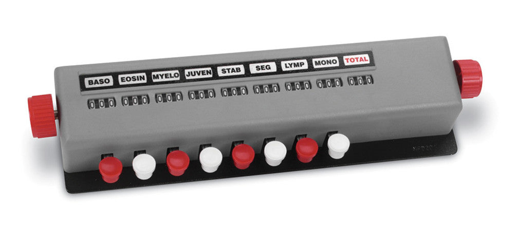 Contador mecánico de mesa para recuento de células sanguíneas, colonias bacterianas o para otras aplicaciones en las que se cuenten diferentes muestras de forma repetida. Cuenta puntos individuales hasta 999. Con ventana de resumen para mostrar el conteo total y una señal audible después de conteos totales de 100. Botón giratorio para restablecer a 0.