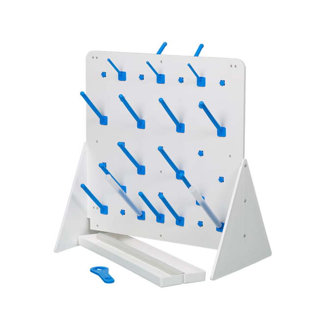 Las varillas, de gran estabilidad, se pueden insertar y enclavar de forma individual en los agujeros del escurridor y cambiar de posición en todo momento. El escurridor, en combinación con las varillas intercambiables de tres longitudes diferentes (60 mm, 100 mm y la prolongación a 150 mm), se puede adaptar a los recipientes a los que se tiene que efectuar el secado.