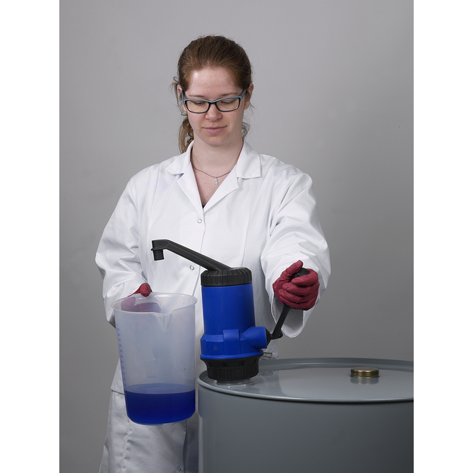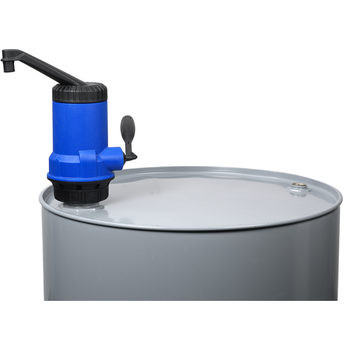 Bomba de palanca autoaspirante compacta de polipropileno, apta para ácidos ligeros y lejías. El tubo telescópico de la bomba de palanca puede extraerse de forma gradual hasta 100 cm, gracias a lo que puede utilizarse con barriles de 50 a 200 l.