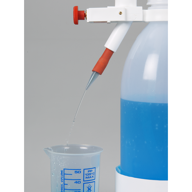 El dosificador Bürkle permite realizar una dosificación precisa y una titración exacta utilizando el botón o el microtornillo, así como un vertido exacto a través del pico delgado.